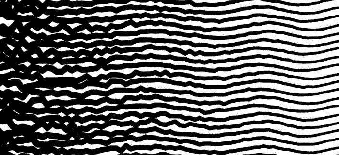 With those elements and a title turned up its head, I envisioned a set of lines neatly next to each other as if on a grid. Each of these lines would grow from the bottom to the top, transforming from chaos into harmony. I tinkered around for a while and can here present you a still frame of the first iteration that gets us close to what I had in mind: