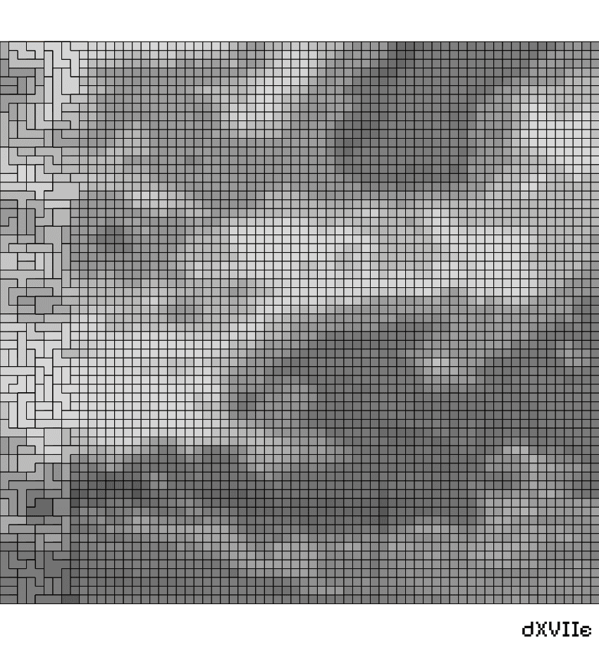 Next up, we're grouping neighboring cells one by one. Each iteration each group can only grow once. I took a bit of a different approach for finding candidate neighbors than the original implementation, so at first I these groups were wildly growing within one iteration. But for this first version I wanted to respect the initial algorithm as much as possible, so I had to figure out a way to limit its growth. Which kind of works now. That we end up with Tetris shapes around iteration 3 was unintentional. But welcomed.