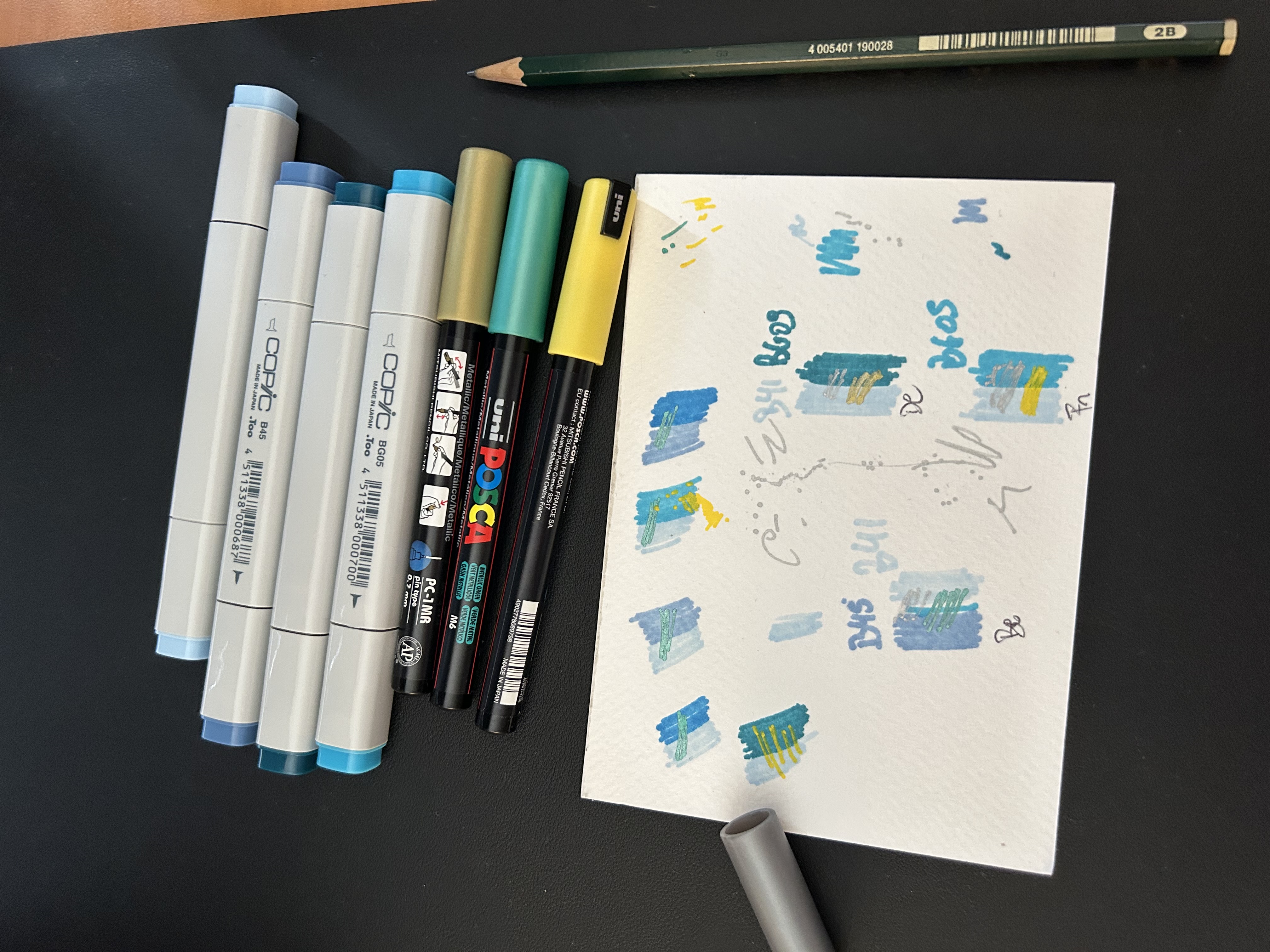 For these cards, I ended up using 4 different shades of blue for the 'base layer' and 4 posca fineliners for the 'top layer'. Both layers consist of two separate colors, giving each of the three cards a unique combination of blues and paints.