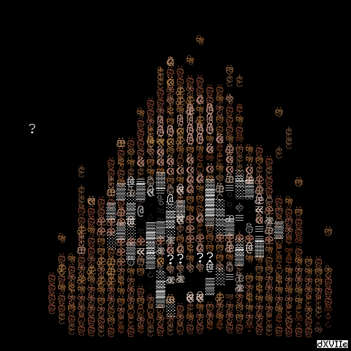←NextPrev→ Jan 24, 2024 Genuary 2024 #09: ASCII.' For the interactive version & a little story, follow the link: 🔗 genuary24.d17e.dev Share on: